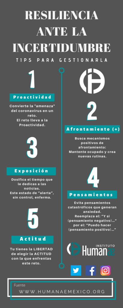La situación de Pandemia por el Covid-19 que estamos viviendo, nos puede llevar a un estado de incertidumbre y desasosiego. ¿Cómo afrontarlo desde la Resiliencia? En Humanae México preparamos esta guía para ti.